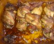 Am invelit fiecare pulpa de pui in bacon, le-am pus intr-un vas termorezistent, am adaugat apa si am dat la cuptor, pentru o ora si ceva, pana au fost gata.