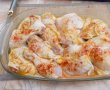 A doua zi asezam pulpele in tava, punem putina boia dulce peste, punem din macerat putin peste pulpe si adaugam si ulei. Dam la cuptorul in prealabil incins la 200 grade. Vasul il acoperim cu o folie de aluminiu si lasam pana sunt aproape gata.