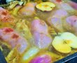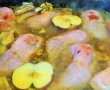 Se curata pulpele, se spala, se pun in tava cu ulei, impreuna cu ceapa taiata in doua, cu usturoiul spalat cu tot cu coaja si taiat in jumatate si se calesc usor, se adauga condimentele, marul, apa, si se pune tava la foc mic pe aragaz timp de 15 minute, avand grija sa intoarcem pulpele de doua ori pe ambele parti. Adaugam si vinul si mai lasam pe foc un minut.