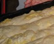 Se imparte aluatul in 6. Din fiecare bucatica se intinde o foaie mare (si subtire) se pune compozitie, insa nu in exces si se ruleaza, din exterior spre interior. Se asaza intr-o tava unsa cu ulei si se da la cuptor incins, timp de 30 min.