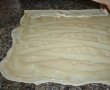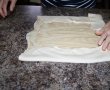 - Fiecare jumatate de aluat o intindem cat putem de mult, apoi impartim umplutura de dovleac in 4 parti egale. Punem umplutura pe marginile aluatului si rulam partile spre interior ca in poza de mai jos.