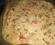 Se toarna compozitia in tava peste hartia de copt si se adauga ardeiul taiat marunt, patrunjelul si cimbrul.