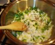 Incepem cu pregatitul umpluturii de creier. Curatam ceapa si o taiem marunt iar ceapa verde o taiem rondele. Incingem intr-o tigaie uleiul si apa si cunem ceapa la inabusit.