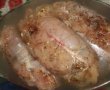 am luat cate o bucata de piept am dat pe razatoare cate putin cascaval, am pus cate o bucata de omleta, cate 2-3 feliute de mozzarella, am rulat, am legat cu ata si am pus in tava, am pus o cana de apa apoi am bagat in cuptor la temperatura potrivita spre mare