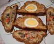 Am intins un strat de carne pe folia de aluminiu,deasupra la carnea am intins un strat de legume,adaugam sunca taiata si ouale pe margine,cu ajutorul foliei rulam,