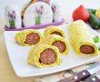 Rasturnam omleta pe un platou, o ungem cu o lingurita de mustar, asezam carnatul la un capat si rulam.