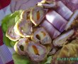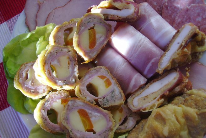 Pe felia de sunca se aseaza doua bucati de cascaval si o felie de morcov,se face un rulou care se "imbraca" in carne tocata.