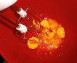 Se prepara maioneza, astfel: se pun galbenusurile cu un praf de sare intr-un castron si se mixeaza, adaugandu-se treptat uleiul, pana cand isi maresc volumul considerabil.