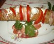 Bagheta se decoreaza cu felii de rosie si bucati de jambon.