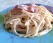 Spaghetele se fierb conform indicatiilor de pe pachet in apa cu sare.Intr-o tigaie se prajeste fleica afumata taiata bucatele.Cand pastele sunt fierte se scurg si se limpezesc cu apa rece.Intr-o cratita se pune ulei de masline ,se pun pastele sa se incalzeasca se pune fleica prajita,busuioc .Se face un sos din 2 galbenusuri ,smantana si cascaval si se pune in fir subtire peste paste amestecand in continuu.Cand sunt gata se servesc calde cu parmezan deasupra.