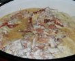 Peste ele se toarna smantana cu baconul fierbinte si amestecul de oua cu parmezan.