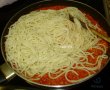 Se lasa sa dea 2-3 clocote dupa care se pun spaghetele scurse de apa in sos ,se amesteca bine toate.