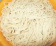 Pastele se fierb instructiunilor de pe ambalaj, punem apa la clocotit cu sare, cand clocoteste punem pastele si fierbem 8 minute. (Asa scria pe ambalajul lor). Le trecem pe sub jet de apa rece si le lasam la scurs.