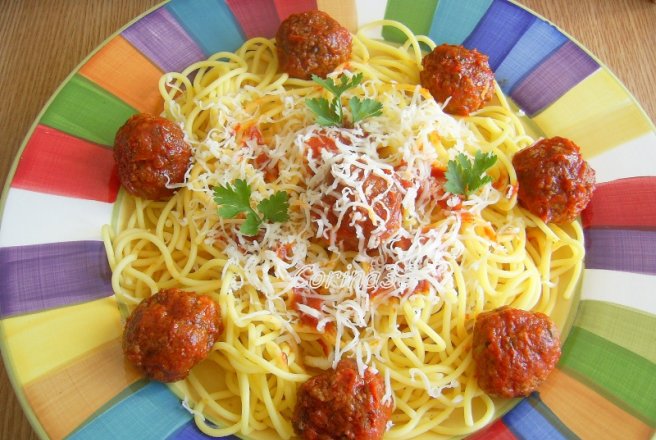 Se aseaza spaghetele pe farfurii, deasupra se pune sosul cu chiftelute, se razuie cascaval sau parmezan si se orneaza cu frunze de patrunjel daca va plac.