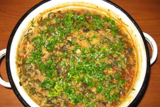 Stevia se curata, se spala si se opareste cu apa clocotita. Apoi se scurge si se taie marunt. Orezul se spala in mai multe ape. Ceapa uscata si cea verde se curata si se taie marunt. Se pun toate intr-o craticioara, se adauga 5 cesti cu apa rece, se condimenteaza si se pune o lingura de ulei. Se pune craticioara in cuptor cam jumatate de ora, pana se umfla orezul. Apoi se adauga sucul de rosii si se lasa sa mai scada 10 minute. Dupa ce se scoate din cuptor, se presara patrunjel verde deasupra.