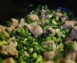 2. Se adaugă ceapa şi usturoiul verde tăiate mărunt. Se lasă să se călească totul 3-4 minute, după care adăugăm sosul de roşii.
