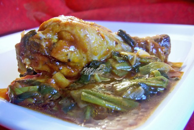 Ceapa si usturoiul se taie bucati potrivite, se calesc usor in putin ulei de masline, apoi se pun peste carnea care este aproape gata.