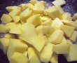 Ceapa curățată și mărunțită se caleste în sosul rămas, cca. 5 minute la foc mic, apoi se adaugă cubulețele de cartofi, se completează cu apă, până se acoperă apoi se lasă la fiert cca. 15 minute, la foc mediu, acoperit.