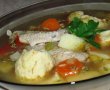 Tocam legumele, le adaugam in supa si le lasam sa fiarba impreuna cam 20-30 de minute. Potrivim de gust cu sare, piper si tarhon, punem si uleiul si lasam sa dea in clocot.