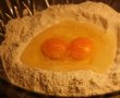 Punem faina pe planul de lucru ,si facem o gropita in mijloc,unde spargem ouale. Cu o furculita incepem sa batem ouale,aducand putin cate putin faina de pe margini. Cand ouale au fost absorbite de faina,incepem sa framantam aproximativ 10 min pana obtinem un aluat elastic si omogen.