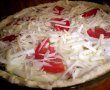 Batem cele doua oua, adaugam smantana, cubuletele de feta, baconul cu ceapa si feliile de dovlecei, sare piper si verdeata si turnam tot amestecul peste tarta. Deasupra punem felii de rosii si cascaval ras. Coacem 30-35 minute.