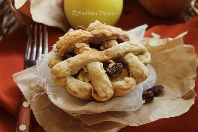 Aluatul se imparte in 7 bucati egale. Formele pentru tarte se ung cu unt. Fiecare bucata de aluat se intinde cu sucitorul si se aranjeaza in tavite(6). Merele se impart in cele 6 forme , se presara si stafidele si putin sos caramel in fiecare. Bucata de aluat ramasa se intinde si se taie fasii din care se face un grilaj deasupra.