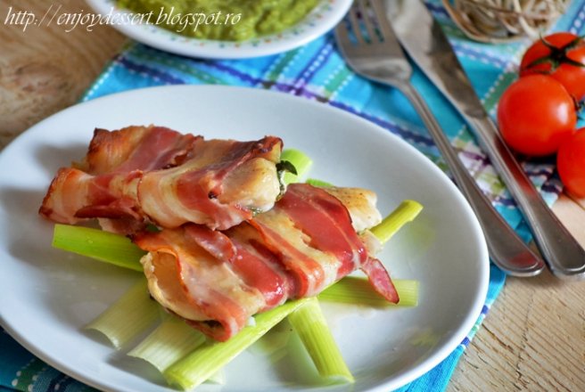 Punem toate bucatile impachetate de peste intr-o tava termorezistenta si turnam 1/3 ceasca de apa si zeama de lamaie. Dam la cuptor timp de 25-30 de minute, pana cand baconul este rumenit frumos.