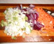 Scoatem carnea si punem ceapa taiata solzisori,morcovul taiat cubulete mici,presaram putina sare si punem un capac deasupra, lasam la calit cca 15 min.,cat sa se inmoaie morcovul si ceapa. Apoi luam capacul, rasturnam conserva cu rosii,adaugam 1/2 cana cu apa si mai lasam sa fiarba 10 min., dupa care adaugam carnea si asezam capacul peste tuci.