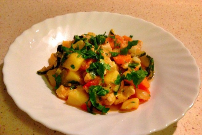 Ceapa o taiem marunt o punem la calit in ulei,adaugam si morcovii taiati rondele. Dovlecelul se spala bine si se taie feliute potrivite,iar cartofii ii taiem cuburi. Pieptul de pui il taiem cubulete si adaugam peste legumele calite,punem si dovlecelul feliute si cartofii. Se pun 2 pahare de apa si se lasa la foc potrivit sa fiarba. Cand scade zeama se adauga bulionul si usturoiul taiat feliute subtiri. Se condimenteaza dupa gust cu sare si piper.