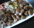 Într-o cratiţă mai mare (am făcut pentru mai multe porţii) se căleşte ceapa ( cca 5 minute) peste care se adaugă cârnaţii tăiaţi la cca 2 cm pentru ca mai apoi să se adauge carnea, ficăţeii, pipotele şi inimile anterior pregătite. Carnea şi pipotele trebuie să fie tăiate în bucăţi de cca 1.5 cm.