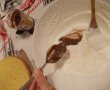 Blatul: batem albusele cu zaharul bine pana cand devine crema spumoasa; adaugam galbenusurile si continuam sa amestecam dar cu o lingura de lemn. Adaugam faina, praful de copt si esenta. Punem la cuptor timp de 30 minute la 180 grade.