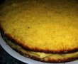 Din acest moment adaugam ouale, unul cate unul. Dupa fiecare mixam bine. Atentie! Nu il punem pe urmatorul pana ce precedentul nu este incorporat foarte bine. Dupa ce ouale au fost introduse in compozitie se adauga faina si amidonul, lingura cu lingura, apoi praful de copt si laptele. Omogenizam. Pregatim o tava de tort, o tapetam cu hartie de copt, punem compozitia si o punem la cuptor pentru 30-35 minute ( cuptorul trebuie sa fie preincalzit). Cand trece de testul scobitorii, blatul este gata. Se scoate pe un gratar si se lasa la rece. Acest blat va fi taiat in doua.