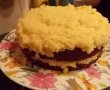Luam de pe aburi si adaugam treptat faina cernuta cu praful de copt si omogenizam bine compozitia. Tapetam o forma de tort de 20 cm cu hartie de copt sau ungem cu unt si tapetam cu faina in care turnam compozitia si dam la cuptorul preincalzit 30-40 minute, la foc potrivit. Facem testul cu scobitoarea. Scoatem si lasam la racit, apoi il taiem in 3 foi. In reteta nu spunea ca trebuie insiropate foile dar eu am insiropat-o doar pe cea de sus cu apa si esenta de rom).
