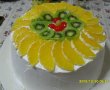 Am batut frisca si am umplut blaturile cu ea si cu fructe din compot asta dupa ce am insiropat blatul in prelabil. Am decorat cu fructe si frisca si gata tortul !