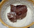Într-un alt vas se pune făina, cacaua, zahărul măcinat, sarea și praful de copt și se omogenizează amestecul, apoi se cerne peste compoziția lichidă și se omogenizează cu telul. Nu se amestecă decât până când amestecul este omogen.