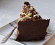 Scoatem prima hartie si cu partea de ciocolata o asezam in jurul tortului, apasam usor sa se lipeasca (nu-i bai daca se sifoneaza putin, asa arata si mai bine) si indepartam apoi hartia de copt. Se indeparteaza foarte usor. Procedam la fel si cu cea de a doua foaie de copt pe care am intins ciocolata.