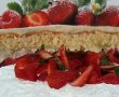 Se insiropeaza feliile si se aplica frisca si capsuni pe fiecare strat. Capsunile pot fi taiete in sferturi si se pot lasa si cateva cu frunza pentru deasupra. Nu trebuie decorat in nici un fel,contrastul dintre alb frisca si capsuni este de ajuns.