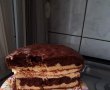 Se da la frigider pana se intareste, apoi se pune cealalta jumatate de crema de vanilie, se pune al 2 lea blat tot cu partea alba in jos, se insiropeaza si se da la rece 2 ore in frigider.