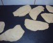 Dupa ce a crescut se ia cate o bucata de aluat se intinde, pe o jumatate se pune cascaval apoi se acopera cu partea cealalta de aluat.