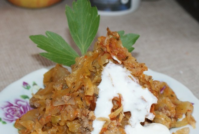Apoi intr-o oala asezam un strat de varza, unul de carne, unul de varza, unul de carne, si tot asa. Ultimul strat trebuie sa fie de varza. Turnam niste suc de rosii deasupra, si dam la cuptor, cam 50 min - 1 ora la 150 grade.