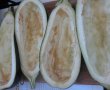 Le taiem in jumatate, pe orizontala. Cu o lingura scoatem miezul vinetelor, presaram vinetele cu sare si le lasam deoparte pentru aprox.20 de minute, apoi le punem intr-o tava si le dam la cuptorul preincalzit pentru 20 de minute. Le tinem la foc mediu.