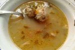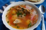 Intr-o oala punem oasele de porc, carnea de pui, cepele si telina taiate cubulete, morcovi rasi si ardei tocati marunt, acoperim cu apa (cam de trei litri) si punem oala pe foc. Lasam sa fiarba si din cand in cand spumam, cu o spumiera. Dupa ce carnea si legumele s-au fiert, adaugam cartofii...